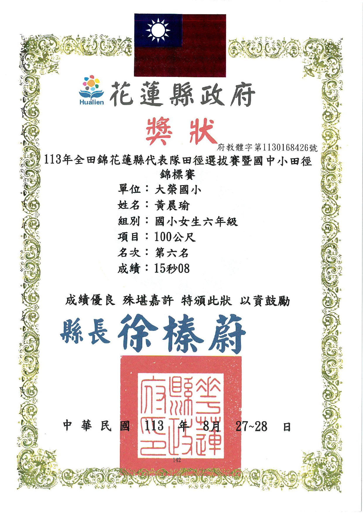 113年全田錦花蓮縣代表隊田徑選拔賽曁國中小田徑錦標賽,國小女生六年級組100公尺,黃晨瑜榮獲第六名