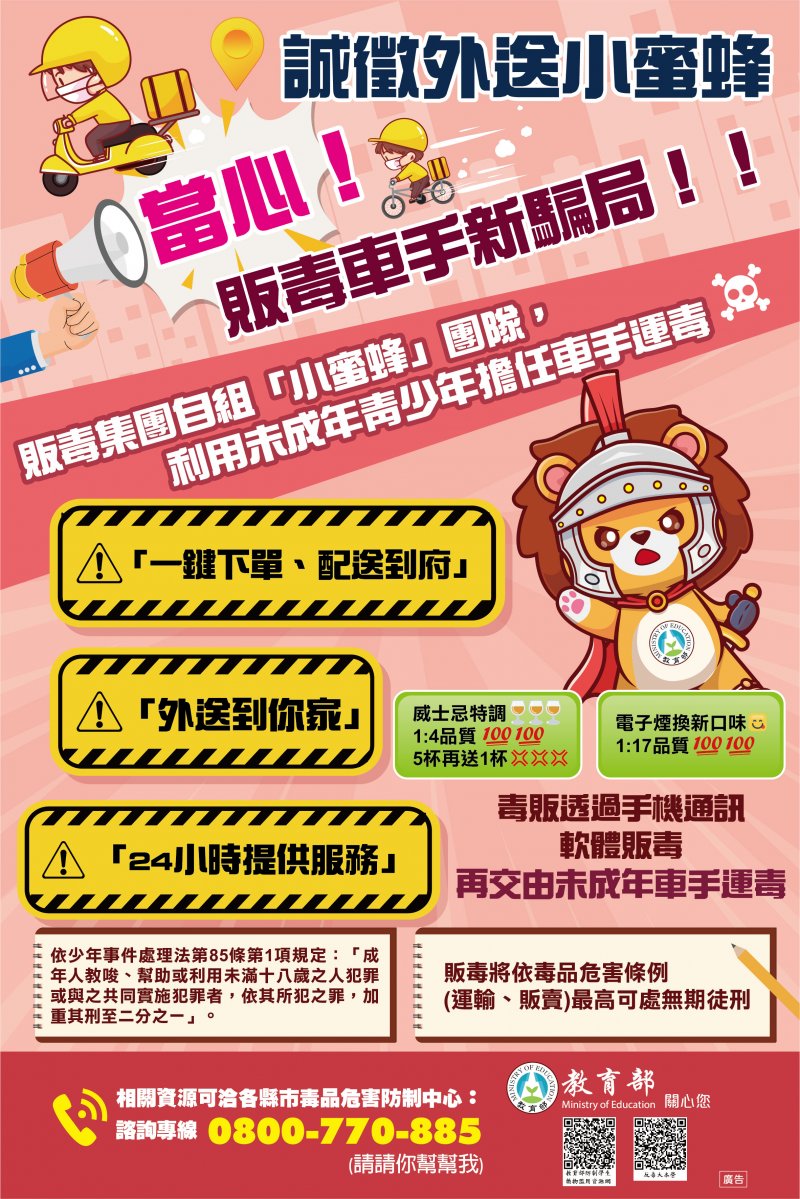 一、電子檔請逕至教育部「防制學生藥物濫用資源網」(文宣專區 https://enc.moe.edu.tw/Poster)下載運用。