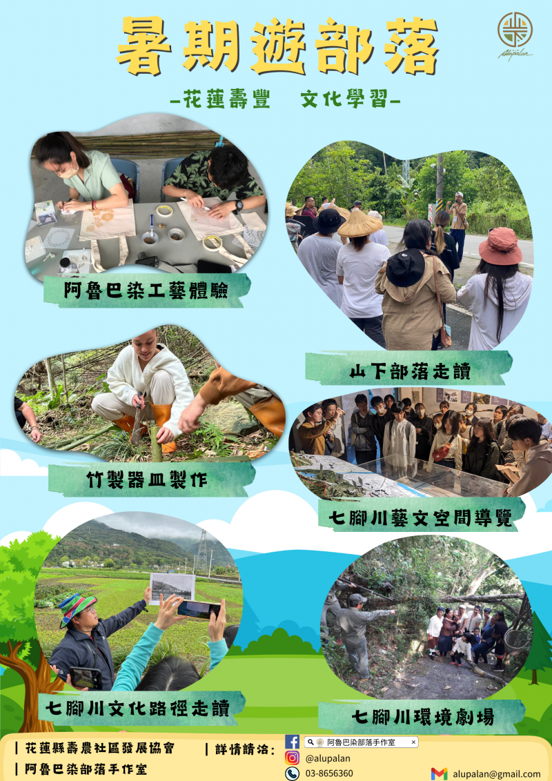 三、多項遊程體驗活動客製半日或一日遊程,或依學校機關需求設計體驗課程,有任何需求皆可聯繫洽詢,辦公室電話:(03)8656360 ,電子信箱: alupalan@gmail.com ,或上 FB 搜尋「阿魯巴染部落手作室」聯繫小編,網址: https://www.facebook.com/alupalan 。