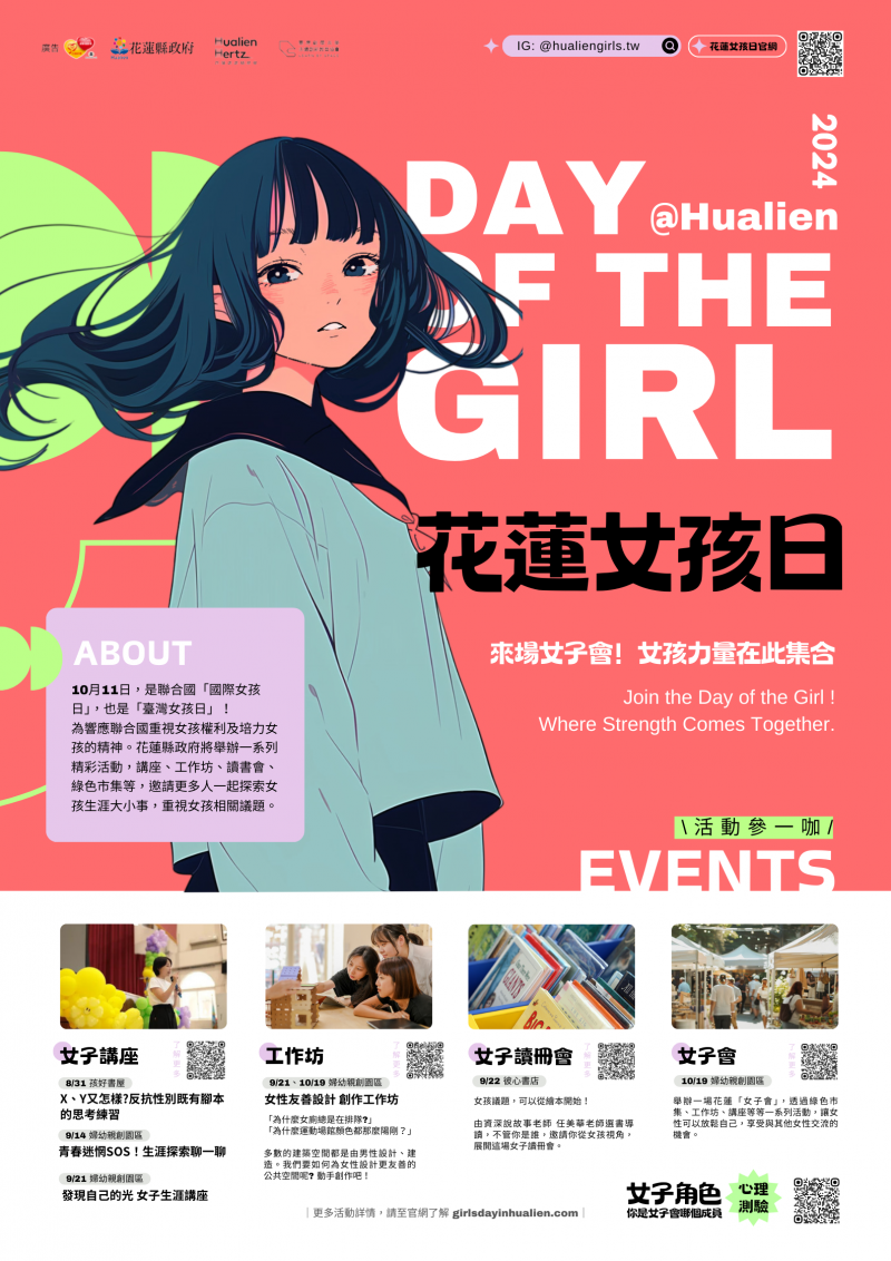一、為促進性別平等教育及增進青少年對女性議題的關注,本府今(113)年舉辦「花蓮女孩日」系列活動,內容包括讀書會、講座、工作坊、與市集等,歡迎貴校學生踴躍參與。