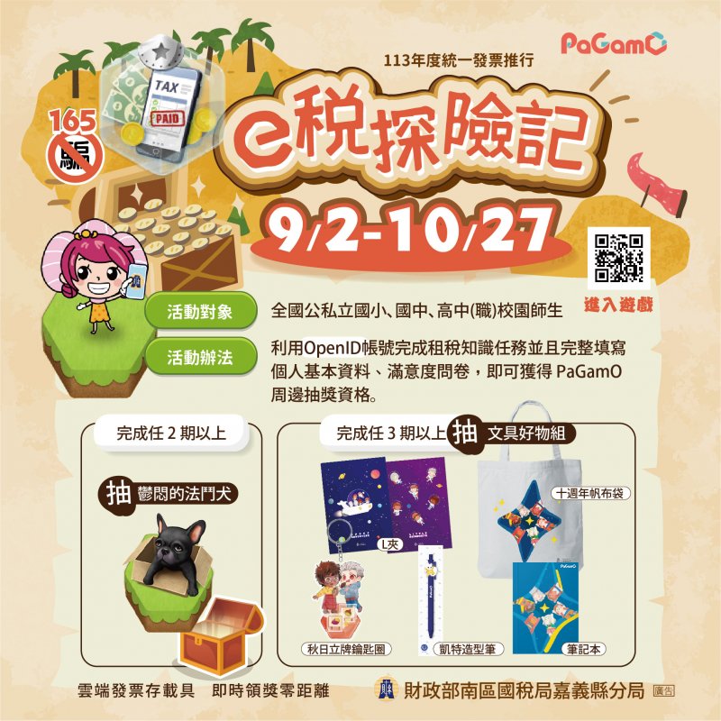 五、動辦法:校園師生在活動期間內利用 Open ID 登入 PaGamO 線上遊戲學習平台,再至任務書點選「世界任務」,選擇「e 稅探險記」任務書,完成任一主題任務(有雲端發票、反詐騙、性別平等、廉能政策總計 4 檔期任務),任務完成可獲得任務限定「虛擬寶物-E 稅載具」作為任務獎勵。
