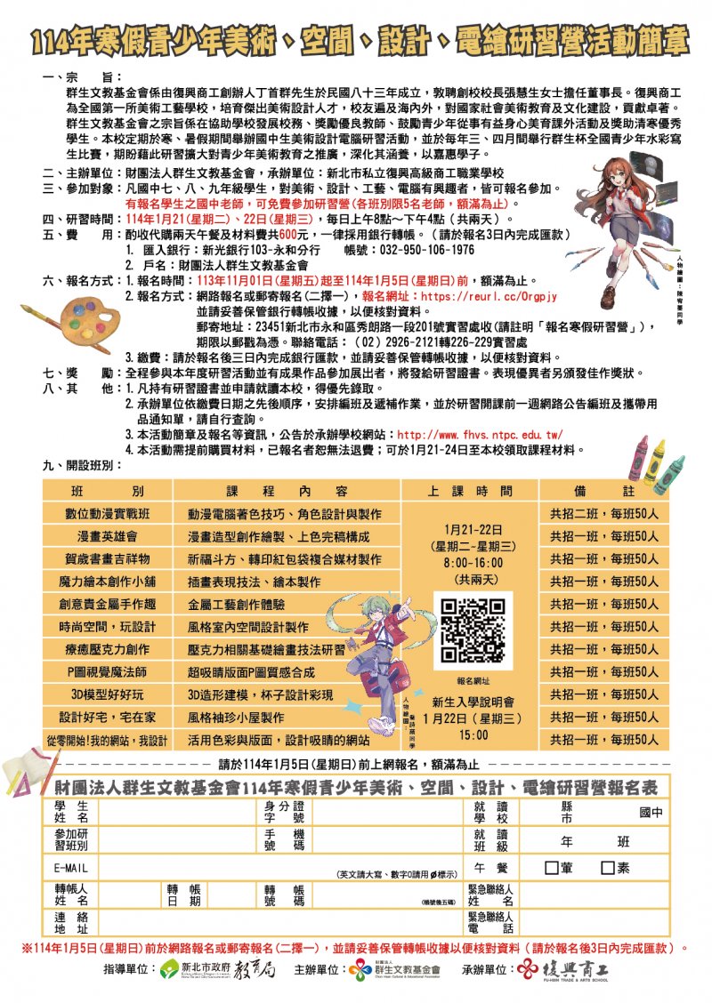 五、報名時間: 113 年 11 月 01 日(星期三)起至 114 年 1 月 05 日(星期五)前,額滿為止。 任何課程相關問題,聯絡電話( 02 ) 2926-2121 轉 226~229 。