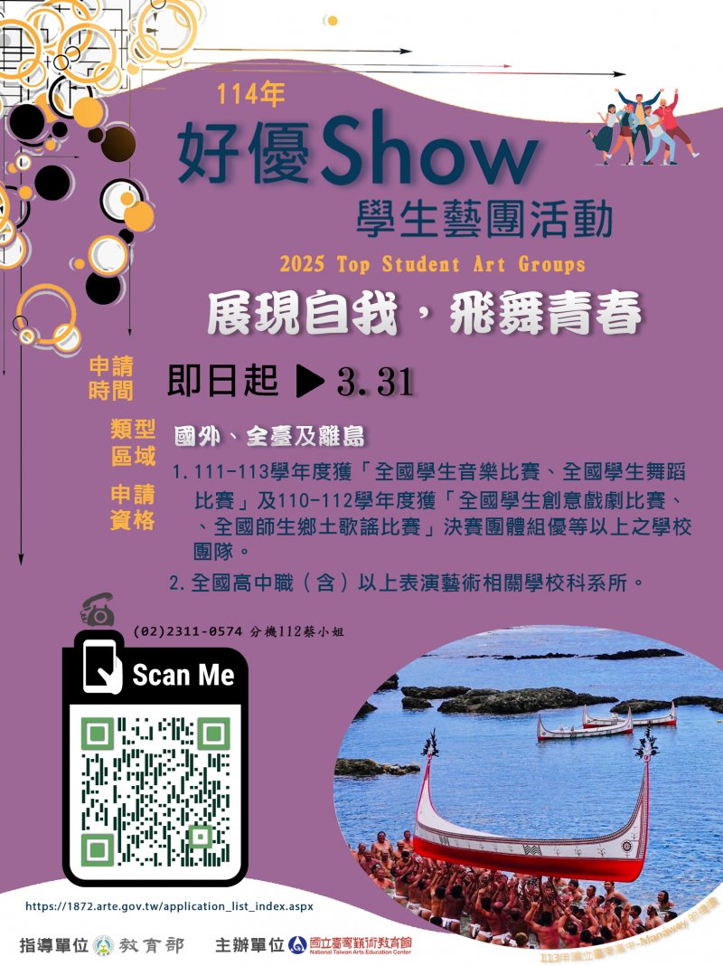一、國立臺灣藝術教育館為鼓勵並持續提供全國表演藝術學校優等以上團隊至全臺各地、離島及國外等展演機會,豐富學習歷程;鼓勵學生透過展演,彼此觀摩學習,充實美感體驗並透過專業藝術教育課程分享,提升學生學習視野,特辦理 114 年好優 Show 學生藝團活動徵選。