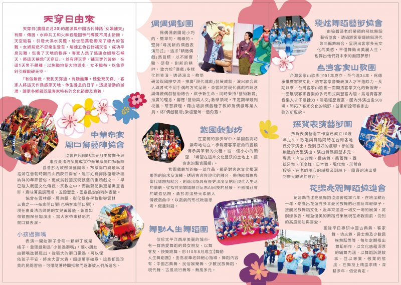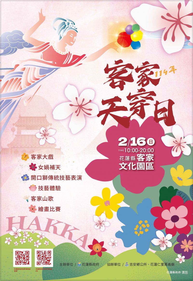 一、旨揭活動訂於 114 年 2 月 16 日(星期日)假花蓮縣客家文化園區(南埔公園)辦理。 二、活動時間自上午 10 時整至下午 8 時整,現場有女媧補天偶劇、客家開口獅、山歌對唱、客家大戲等豐富多元表演,以及市集、 DIY 體驗區、兒童繪畫比賽等精彩活動,敬請惠予協助宣傳。