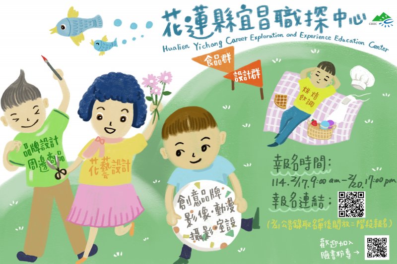 三、第一階段報名時間自 114 年 2 月 17 日 9:00 至 2 月 20 日 17:00 ,請逕自報名網址 https://reurl.cc/86MzaX 進行報名作業,或於「花蓮縣宜昌區域職業試探與體驗示範中心」粉專點選報名連結,或掃描海報 QR code 報名,第一階段錄取名單將於 114 年 2 月 21 日公告於粉絲專頁,並自公告名單後開放第二階段報名。