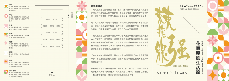 一、國立臺東生活美學館將於 6 月 7 日至 7 月 20 日假花蓮市文化創意產業園區第 11 棟,舉辦「2025 花東原創生活節-東東攏總強」特展,展區規劃 13 位花東工藝師們的原創工藝品展區、工藝師導覽、原創生活市集、音樂彈唱會及手作體驗活動。