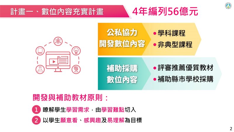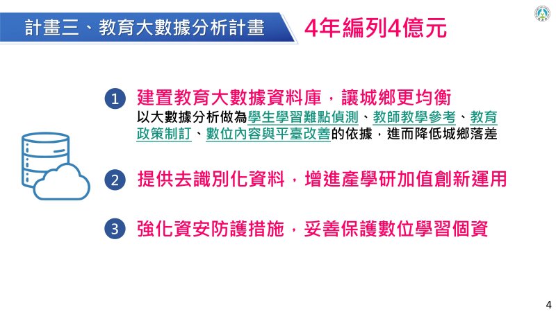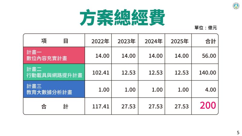 行政院蘇院長今( 25 )日在行政院會聽取教育部報告「推動中 小學數位學習精進方案」,政府將自 111 年起投入經費 117 億元, 連續 4 年總預算達 200 億元,針對全國中小學 1 年級至 12 年級全面 推動數位學習精進計畫,達成「班班有網路 生生用平板」。 教育部指出,透過前瞻基礎建設計畫 106 年至 114 年投入 150 億 元,強化校園網路佈建與建置智慧學習教室等設施作為基礎,在經歷 疫情期間加速數位教學推動,教育部在盤整現有數位建設基礎下,提 出「中小學數位學習精進方案」,規劃「數位內容充實」、「行動載 具與網路提升」及「教育大數據分析」3 項計畫,期透過本方案達成 「教材更生動」、「書包更輕便」、「教學更多元」、「學習更有 效」、「城鄉更均衡」5 大目標。 數位內容充實計畫主要為數位內容開發及補助縣市學校採購數位 內容及教學軟體,以學生願意讀、感興趣、易理解,可學習到教材中 的知識為前提,透過公私協力及部會合作開發多元化數位內容,包括 發展學科課程及非典型課程,以影音、遊戲式、虛擬實境、模擬互動 等形式呈現,並建立優質數位內容採購機制,讓教材更生動、教學更 多元。 2 行動載具與網路提升計畫擴充中小學校與縣市教育網路中心對外 連網頻寬,補充 3.09 萬臺無線 AP ,完備教室無線網路,達成班班可 無線上網目標。前因疫情影響學生改採居家學習,行動載具仍有不足, 因此,除現有已配發各縣市 20.7 萬臺行動載具外,教育部將再規劃 投入 61 萬臺學習載具,並搭配行動載具管理系統派送學習內容與 APP ,在此規劃下,配發總量達到偏遠地區學校學生載具比率為 1:1 ; 非偏遠地區則以學校班級數每 6 班補助 1 班方式配發,教師依課程教 學與數位學習需求輪流借用,達到生生用平板目標,並延伸擴大數位 學習場域,強化數位科技與課後扶助應用並透過運用遠距陪伴學習與 跨校共學,讓數位學習成為偏鄉師生的日常,城鄉教育更均衡。本計 畫也將整合大學與民間能量建立在職教師增能機制與支持系統,提升 教師數位教學能力。 教育大數據分析計畫則是運用學生線上學習資料建置教育大數據 資料庫,作為學習成效、教學模式、政策研訂與數位內容改善的基礎, 讓城鄉學習更均衡,未來在符合資安前提下建立去識別化開放資料, 提供民間加值創新運用。 教育部表示,配合方案推動,教師依課程需要設計相關課程時, 也需參考國健署視力衛教建議,並持續進行學生使用載具的網路素養 教育及宣導,確保兒童及青少年上網安全與強化校園資安管理。本方 案推動呼應國際數位學習趨勢,以「偏鄉學校數位優先」的原則,並 於疫情期間可支援經濟弱勢及多子家庭缺乏載具時使用,以縮減城鄉 教育落差達公平教育的目標。