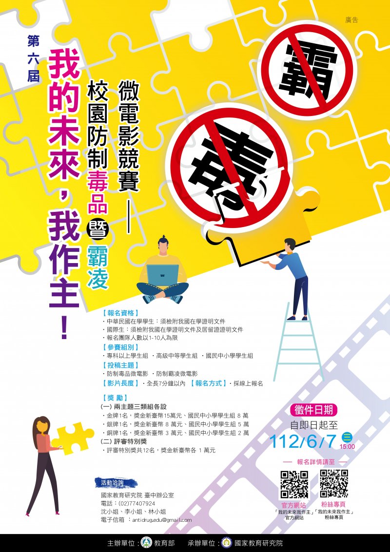教育部第六屆「我的未來我做主」校園防制毒品暨霸凌微電影競賽活動徵件須知及宣傳海報,請各級學校宣導並鼓勵學生踴躍報名。